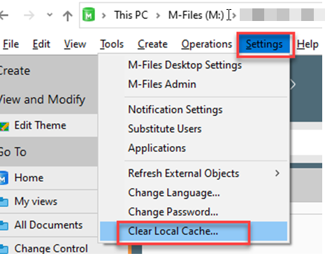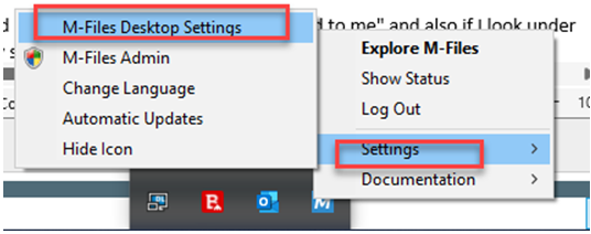 3. Click on the m-files logo in bottom right corner – next to your clock – then settings – m-files desktop setting