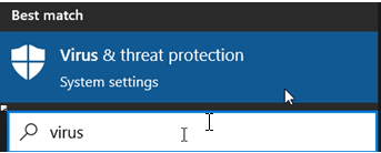 1. Search for “virus” in the Windows search bar and click Virus & threat protection: